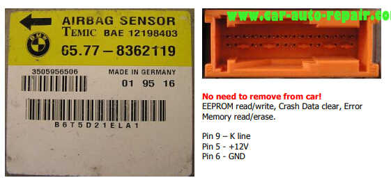 使用这些图片你可以“对表”擦除安全气囊-你必须连接GND,+ 12V和安全气囊传感器和BMW安全气囊橡皮擦之间的诊断线路,连接电源GND和+ 12V和使用橡皮擦一样在车上。擦除不要再接通电源后-宝马气囊传感器是非常敏感的,没有车在桌子上连接后,可以写“控制器故障”的错误。OBDII -宝马20针连接图(或者你可以用户的任何OBDII宝马转换器):