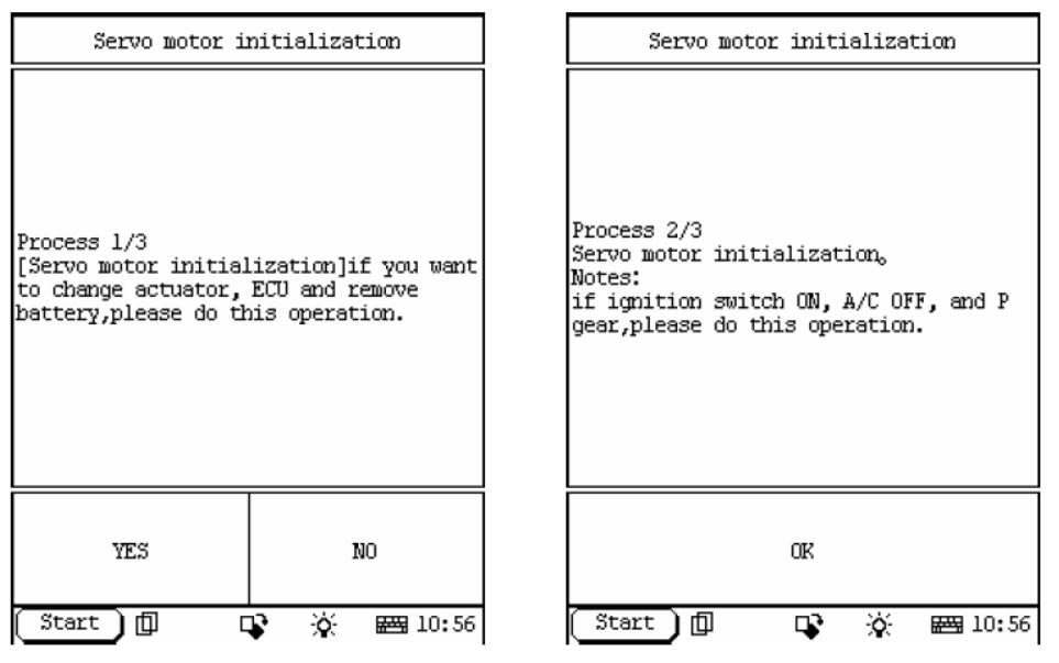 点击功能菜单之后,屏幕上会显示进程1/3菜单。它会提示你的是:如果你想改变执行机构,ECU并取出电池,请执行此操作。按“YES”做伺服电机的初始化。按“NO”退出。确认在该操作之后,屏幕上会显示处理2/3菜单:伺服马达初始化。注:请做到这一点的操作与点火开关ON,A / C OFF和P档。满足这些条件后,按OK键进入流程3/3菜单:伺服电机初始化]开始。DEF闪烁的指示灯熄灭,按确定后,则该操作完成。