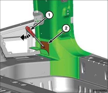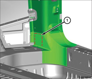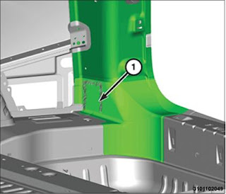 4. 使用平刃工具 (1) 或等效工具,从空腔中取出泡沫。5. 关闭窗口回到原来的位置。6. 通过焊接或使用结构性粘合剂补片封闭检修孔。焊接a. 研磨边缘以去除涂层以暴露裸露的金属。湾 使用标准钢标识(请参阅 31 - 碰撞信息/规范/标准钢标识)中找到的适当方法缝合关闭窗口 (1)。C。使用研磨盘,平滑焊缝。结构胶一。创建一个比开口大 25 毫米(1 英寸)的金属贴片。